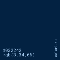 Цвет #032242 в цветовой модели RGB обозначается тремя октетами (3, 34, 66) в десятичном формате и #032242 в шестнадцатиричном (hex) формате, которые являются интенсивностью красного 3 (hex 03), интенсивность зелёного 34 (hex 22) и интенсивность синего 66 (hex 42).