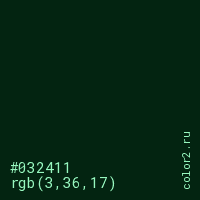 Цвет #032411 в цветовой модели RGB обозначается тремя октетами (3, 36, 17) в десятичном формате и #032411 в шестнадцатиричном (hex) формате, которые являются интенсивностью красного 3 (hex 03), интенсивность зелёного 36 (hex 24) и интенсивность синего 17 (hex 11).