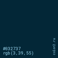 Цвет #032737 в цветовой модели RGB обозначается тремя октетами (3, 39, 55) в десятичном формате и #032737 в шестнадцатиричном (hex) формате, которые являются интенсивностью красного 3 (hex 03), интенсивность зелёного 39 (hex 27) и интенсивность синего 55 (hex 37).