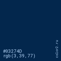Цвет #03274D в цветовой модели RGB обозначается тремя октетами (3, 39, 77) в десятичном формате и #03274D в шестнадцатиричном (hex) формате, которые являются интенсивностью красного 3 (hex 03), интенсивность зелёного 39 (hex 27) и интенсивность синего 77 (hex 4D).