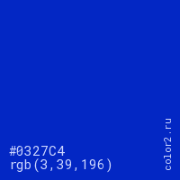 Цвет #0327C4 в цветовой модели RGB обозначается тремя октетами (3, 39, 196) в десятичном формате и #0327C4 в шестнадцатиричном (hex) формате, которые являются интенсивностью красного 3 (hex 03), интенсивность зелёного 39 (hex 27) и интенсивность синего 196 (hex C4).