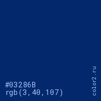 Цвет #03286B в цветовой модели RGB обозначается тремя октетами (3, 40, 107) в десятичном формате и #03286B в шестнадцатиричном (hex) формате, которые являются интенсивностью красного 3 (hex 03), интенсивность зелёного 40 (hex 28) и интенсивность синего 107 (hex 6B).
