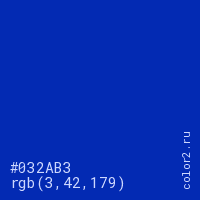 Цвет #032AB3 в цветовой модели RGB обозначается тремя октетами (3, 42, 179) в десятичном формате и #032AB3 в шестнадцатиричном (hex) формате, которые являются интенсивностью красного 3 (hex 03), интенсивность зелёного 42 (hex 2A) и интенсивность синего 179 (hex B3).