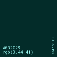 Цвет #032C29 в цветовой модели RGB обозначается тремя октетами (3, 44, 41) в десятичном формате и #032C29 в шестнадцатиричном (hex) формате, которые являются интенсивностью красного 3 (hex 03), интенсивность зелёного 44 (hex 2C) и интенсивность синего 41 (hex 29).