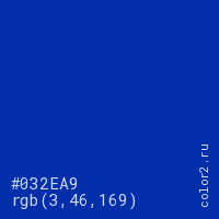 Цвет #032EA9 в цветовой модели RGB обозначается тремя октетами (3, 46, 169) в десятичном формате и #032EA9 в шестнадцатиричном (hex) формате, которые являются интенсивностью красного 3 (hex 03), интенсивность зелёного 46 (hex 2E) и интенсивность синего 169 (hex A9).