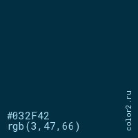Цвет #032F42 в цветовой модели RGB обозначается тремя октетами (3, 47, 66) в десятичном формате и #032F42 в шестнадцатиричном (hex) формате, которые являются интенсивностью красного 3 (hex 03), интенсивность зелёного 47 (hex 2F) и интенсивность синего 66 (hex 42).
