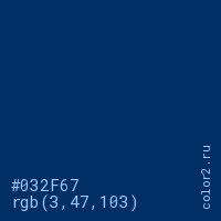 Цвет #032F67 в цветовой модели RGB обозначается тремя октетами (3, 47, 103) в десятичном формате и #032F67 в шестнадцатиричном (hex) формате, которые являются интенсивностью красного 3 (hex 03), интенсивность зелёного 47 (hex 2F) и интенсивность синего 103 (hex 67).