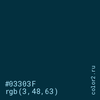 Цвет #03303F в цветовой модели RGB обозначается тремя октетами (3, 48, 63) в десятичном формате и #03303F в шестнадцатиричном (hex) формате, которые являются интенсивностью красного 3 (hex 03), интенсивность зелёного 48 (hex 30) и интенсивность синего 63 (hex 3F).