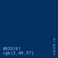 Цвет #033161 в цветовой модели RGB обозначается тремя октетами (3, 49, 97) в десятичном формате и #033161 в шестнадцатиричном (hex) формате, которые являются интенсивностью красного 3 (hex 03), интенсивность зелёного 49 (hex 31) и интенсивность синего 97 (hex 61).