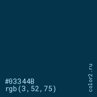 Цвет #03344B в цветовой модели RGB обозначается тремя октетами (3, 52, 75) в десятичном формате и #03344B в шестнадцатиричном (hex) формате, которые являются интенсивностью красного 3 (hex 03), интенсивность зелёного 52 (hex 34) и интенсивность синего 75 (hex 4B).