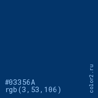 Цвет #03356A в цветовой модели RGB обозначается тремя октетами (3, 53, 106) в десятичном формате и #03356A в шестнадцатиричном (hex) формате, которые являются интенсивностью красного 3 (hex 03), интенсивность зелёного 53 (hex 35) и интенсивность синего 106 (hex 6A).