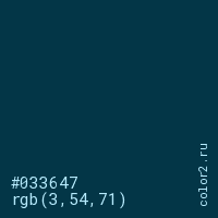 Цвет #033647 в цветовой модели RGB обозначается тремя октетами (3, 54, 71) в десятичном формате и #033647 в шестнадцатиричном (hex) формате, которые являются интенсивностью красного 3 (hex 03), интенсивность зелёного 54 (hex 36) и интенсивность синего 71 (hex 47).