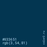 Цвет #033651 в цветовой модели RGB обозначается тремя октетами (3, 54, 81) в десятичном формате и #033651 в шестнадцатиричном (hex) формате, которые являются интенсивностью красного 3 (hex 03), интенсивность зелёного 54 (hex 36) и интенсивность синего 81 (hex 51).