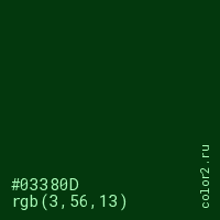 Цвет #03380D в цветовой модели RGB обозначается тремя октетами (3, 56, 13) в десятичном формате и #03380D в шестнадцатиричном (hex) формате, которые являются интенсивностью красного 3 (hex 03), интенсивность зелёного 56 (hex 38) и интенсивность синего 13 (hex 0D).