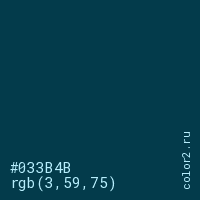 Цвет #033B4B в цветовой модели RGB обозначается тремя октетами (3, 59, 75) в десятичном формате и #033B4B в шестнадцатиричном (hex) формате, которые являются интенсивностью красного 3 (hex 03), интенсивность зелёного 59 (hex 3B) и интенсивность синего 75 (hex 4B).