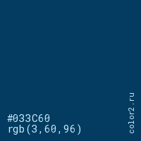 Цвет #033C60 в цветовой модели RGB обозначается тремя октетами (3, 60, 96) в десятичном формате и #033C60 в шестнадцатиричном (hex) формате, которые являются интенсивностью красного 3 (hex 03), интенсивность зелёного 60 (hex 3C) и интенсивность синего 96 (hex 60).
