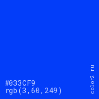 Цвет #033CF9 в цветовой модели RGB обозначается тремя октетами (3, 60, 249) в десятичном формате и #033CF9 в шестнадцатиричном (hex) формате, которые являются интенсивностью красного 3 (hex 03), интенсивность зелёного 60 (hex 3C) и интенсивность синего 249 (hex F9).
