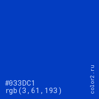 Цвет #033DC1 в цветовой модели RGB обозначается тремя октетами (3, 61, 193) в десятичном формате и #033DC1 в шестнадцатиричном (hex) формате, которые являются интенсивностью красного 3 (hex 03), интенсивность зелёного 61 (hex 3D) и интенсивность синего 193 (hex C1).