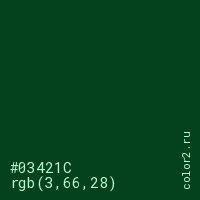 Цвет #03421C в цветовой модели RGB обозначается тремя октетами (3, 66, 28) в десятичном формате и #03421C в шестнадцатиричном (hex) формате, которые являются интенсивностью красного 3 (hex 03), интенсивность зелёного 66 (hex 42) и интенсивность синего 28 (hex 1C).
