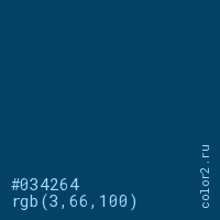 Цвет #034264 в цветовой модели RGB обозначается тремя октетами (3, 66, 100) в десятичном формате и #034264 в шестнадцатиричном (hex) формате, которые являются интенсивностью красного 3 (hex 03), интенсивность зелёного 66 (hex 42) и интенсивность синего 100 (hex 64).