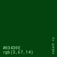 Цвет #03430E в цветовой модели RGB обозначается тремя октетами (3, 67, 14) в десятичном формате и #03430E в шестнадцатиричном (hex) формате, которые являются интенсивностью красного 3 (hex 03), интенсивность зелёного 67 (hex 43) и интенсивность синего 14 (hex 0E).