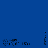 Цвет #034499 в цветовой модели RGB обозначается тремя октетами (3, 68, 153) в десятичном формате и #034499 в шестнадцатиричном (hex) формате, которые являются интенсивностью красного 3 (hex 03), интенсивность зелёного 68 (hex 44) и интенсивность синего 153 (hex 99).