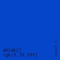 Цвет #0346C7 в цветовой модели RGB обозначается тремя октетами (3, 70, 199) в десятичном формате и #0346C7 в шестнадцатиричном (hex) формате, которые являются интенсивностью красного 3 (hex 03), интенсивность зелёного 70 (hex 46) и интенсивность синего 199 (hex C7).