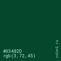 Цвет #03482D в цветовой модели RGB обозначается тремя октетами (3, 72, 45) в десятичном формате и #03482D в шестнадцатиричном (hex) формате, которые являются интенсивностью красного 3 (hex 03), интенсивность зелёного 72 (hex 48) и интенсивность синего 45 (hex 2D).