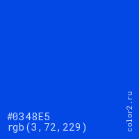 Цвет #0348E5 в цветовой модели RGB обозначается тремя октетами (3, 72, 229) в десятичном формате и #0348E5 в шестнадцатиричном (hex) формате, которые являются интенсивностью красного 3 (hex 03), интенсивность зелёного 72 (hex 48) и интенсивность синего 229 (hex E5).