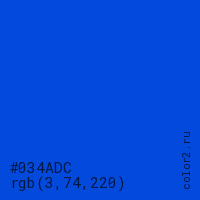 Цвет #034ADC в цветовой модели RGB обозначается тремя октетами (3, 74, 220) в десятичном формате и #034ADC в шестнадцатиричном (hex) формате, которые являются интенсивностью красного 3 (hex 03), интенсивность зелёного 74 (hex 4A) и интенсивность синего 220 (hex DC).