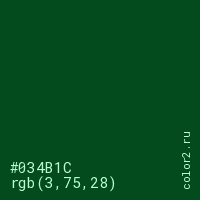 Цвет #034B1C в цветовой модели RGB обозначается тремя октетами (3, 75, 28) в десятичном формате и #034B1C в шестнадцатиричном (hex) формате, которые являются интенсивностью красного 3 (hex 03), интенсивность зелёного 75 (hex 4B) и интенсивность синего 28 (hex 1C).