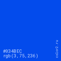 Цвет #034BEC в цветовой модели RGB обозначается тремя октетами (3, 75, 236) в десятичном формате и #034BEC в шестнадцатиричном (hex) формате, которые являются интенсивностью красного 3 (hex 03), интенсивность зелёного 75 (hex 4B) и интенсивность синего 236 (hex EC).