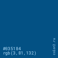 Цвет #035184 в цветовой модели RGB обозначается тремя октетами (3, 81, 132) в десятичном формате и #035184 в шестнадцатиричном (hex) формате, которые являются интенсивностью красного 3 (hex 03), интенсивность зелёного 81 (hex 51) и интенсивность синего 132 (hex 84).