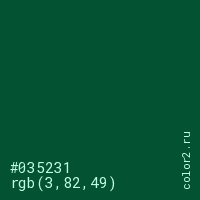 Цвет #035231 в цветовой модели RGB обозначается тремя октетами (3, 82, 49) в десятичном формате и #035231 в шестнадцатиричном (hex) формате, которые являются интенсивностью красного 3 (hex 03), интенсивность зелёного 82 (hex 52) и интенсивность синего 49 (hex 31).