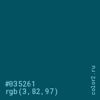Цвет #035261 в цветовой модели RGB обозначается тремя октетами (3, 82, 97) в десятичном формате и #035261 в шестнадцатиричном (hex) формате, которые являются интенсивностью красного 3 (hex 03), интенсивность зелёного 82 (hex 52) и интенсивность синего 97 (hex 61).