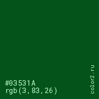 Цвет #03531A в цветовой модели RGB обозначается тремя октетами (3, 83, 26) в десятичном формате и #03531A в шестнадцатиричном (hex) формате, которые являются интенсивностью красного 3 (hex 03), интенсивность зелёного 83 (hex 53) и интенсивность синего 26 (hex 1A).