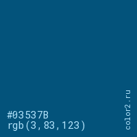 Цвет #03537B в цветовой модели RGB обозначается тремя октетами (3, 83, 123) в десятичном формате и #03537B в шестнадцатиричном (hex) формате, которые являются интенсивностью красного 3 (hex 03), интенсивность зелёного 83 (hex 53) и интенсивность синего 123 (hex 7B).