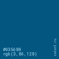 Цвет #035680 в цветовой модели RGB обозначается тремя октетами (3, 86, 128) в десятичном формате и #035680 в шестнадцатиричном (hex) формате, которые являются интенсивностью красного 3 (hex 03), интенсивность зелёного 86 (hex 56) и интенсивность синего 128 (hex 80).