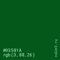 Цвет #03581A в цветовой модели RGB обозначается тремя октетами (3, 88, 26) в десятичном формате и #03581A в шестнадцатиричном (hex) формате, которые являются интенсивностью красного 3 (hex 03), интенсивность зелёного 88 (hex 58) и интенсивность синего 26 (hex 1A).