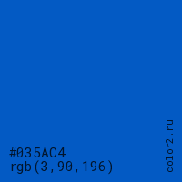 Цвет #035AC4 в цветовой модели RGB обозначается тремя октетами (3, 90, 196) в десятичном формате и #035AC4 в шестнадцатиричном (hex) формате, которые являются интенсивностью красного 3 (hex 03), интенсивность зелёного 90 (hex 5A) и интенсивность синего 196 (hex C4).