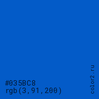 Цвет #035BC8 в цветовой модели RGB обозначается тремя октетами (3, 91, 200) в десятичном формате и #035BC8 в шестнадцатиричном (hex) формате, которые являются интенсивностью красного 3 (hex 03), интенсивность зелёного 91 (hex 5B) и интенсивность синего 200 (hex C8).