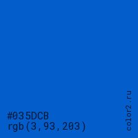 Цвет #035DCB в цветовой модели RGB обозначается тремя октетами (3, 93, 203) в десятичном формате и #035DCB в шестнадцатиричном (hex) формате, которые являются интенсивностью красного 3 (hex 03), интенсивность зелёного 93 (hex 5D) и интенсивность синего 203 (hex CB).