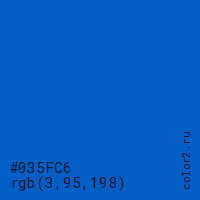 Цвет #035FC6 в цветовой модели RGB обозначается тремя октетами (3, 95, 198) в десятичном формате и #035FC6 в шестнадцатиричном (hex) формате, которые являются интенсивностью красного 3 (hex 03), интенсивность зелёного 95 (hex 5F) и интенсивность синего 198 (hex C6).