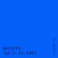 Цвет #035FF9 в цветовой модели RGB обозначается тремя октетами (3, 95, 249) в десятичном формате и #035FF9 в шестнадцатиричном (hex) формате, которые являются интенсивностью красного 3 (hex 03), интенсивность зелёного 95 (hex 5F) и интенсивность синего 249 (hex F9).