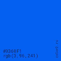 Цвет #0360F1 в цветовой модели RGB обозначается тремя октетами (3, 96, 241) в десятичном формате и #0360F1 в шестнадцатиричном (hex) формате, которые являются интенсивностью красного 3 (hex 03), интенсивность зелёного 96 (hex 60) и интенсивность синего 241 (hex F1).