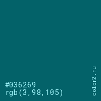 Цвет #036269 в цветовой модели RGB обозначается тремя октетами (3, 98, 105) в десятичном формате и #036269 в шестнадцатиричном (hex) формате, которые являются интенсивностью красного 3 (hex 03), интенсивность зелёного 98 (hex 62) и интенсивность синего 105 (hex 69).