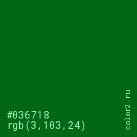 Цвет #036718 в цветовой модели RGB обозначается тремя октетами (3, 103, 24) в десятичном формате и #036718 в шестнадцатиричном (hex) формате, которые являются интенсивностью красного 3 (hex 03), интенсивность зелёного 103 (hex 67) и интенсивность синего 24 (hex 18).