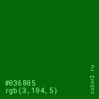 Цвет #036805 в цветовой модели RGB обозначается тремя октетами (3, 104, 5) в десятичном формате и #036805 в шестнадцатиричном (hex) формате, которые являются интенсивностью красного 3 (hex 03), интенсивность зелёного 104 (hex 68) и интенсивность синего 5 (hex 05).