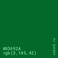 Цвет #03692A в цветовой модели RGB обозначается тремя октетами (3, 105, 42) в десятичном формате и #03692A в шестнадцатиричном (hex) формате, которые являются интенсивностью красного 3 (hex 03), интенсивность зелёного 105 (hex 69) и интенсивность синего 42 (hex 2A).