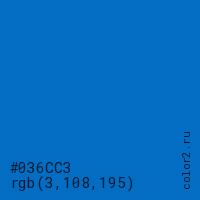 Цвет #036CC3 в цветовой модели RGB обозначается тремя октетами (3, 108, 195) в десятичном формате и #036CC3 в шестнадцатиричном (hex) формате, которые являются интенсивностью красного 3 (hex 03), интенсивность зелёного 108 (hex 6C) и интенсивность синего 195 (hex C3).